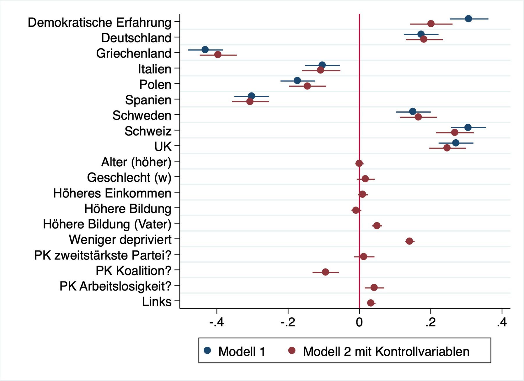 Die Ergebnisse in der Abbildung zeigen, dass politisches Engagement in der Schule und an der Universität wie vermutet einen positiven Einfluss darauf hat, ob die Befragten politischen Institutionen vertrauen, selbst wenn unterschiedliche nationale Kontexte berücksichtigt werden (Länder-Fixeffekte). Wie das zweite Modell zeigt, sind hingegen höheres Einkommen, Geschlecht, Alter und Bildung irrelevant (die Koeffizienten sind nahe Null). Die Bildung des Vaters und damit der soziale Hintergrund spielen jedoch eine Rolle, wenn auch vergleichsweise weniger als demokratische Erfahrungen in der Schule/Universität. Der Zusammenhang zwischen politischem Wissen und politischen Einstellungen scheint kompliziert zu sein: Während das (korrekt wiedergegebene) Wissen um die gegenwärtigen Koalitionspartner der nationalen Regierung einen negativen Effekt auf Vertrauen hat, ist das Wissen um die tatsächliche Arbeitslosenrate positiv korreliert.