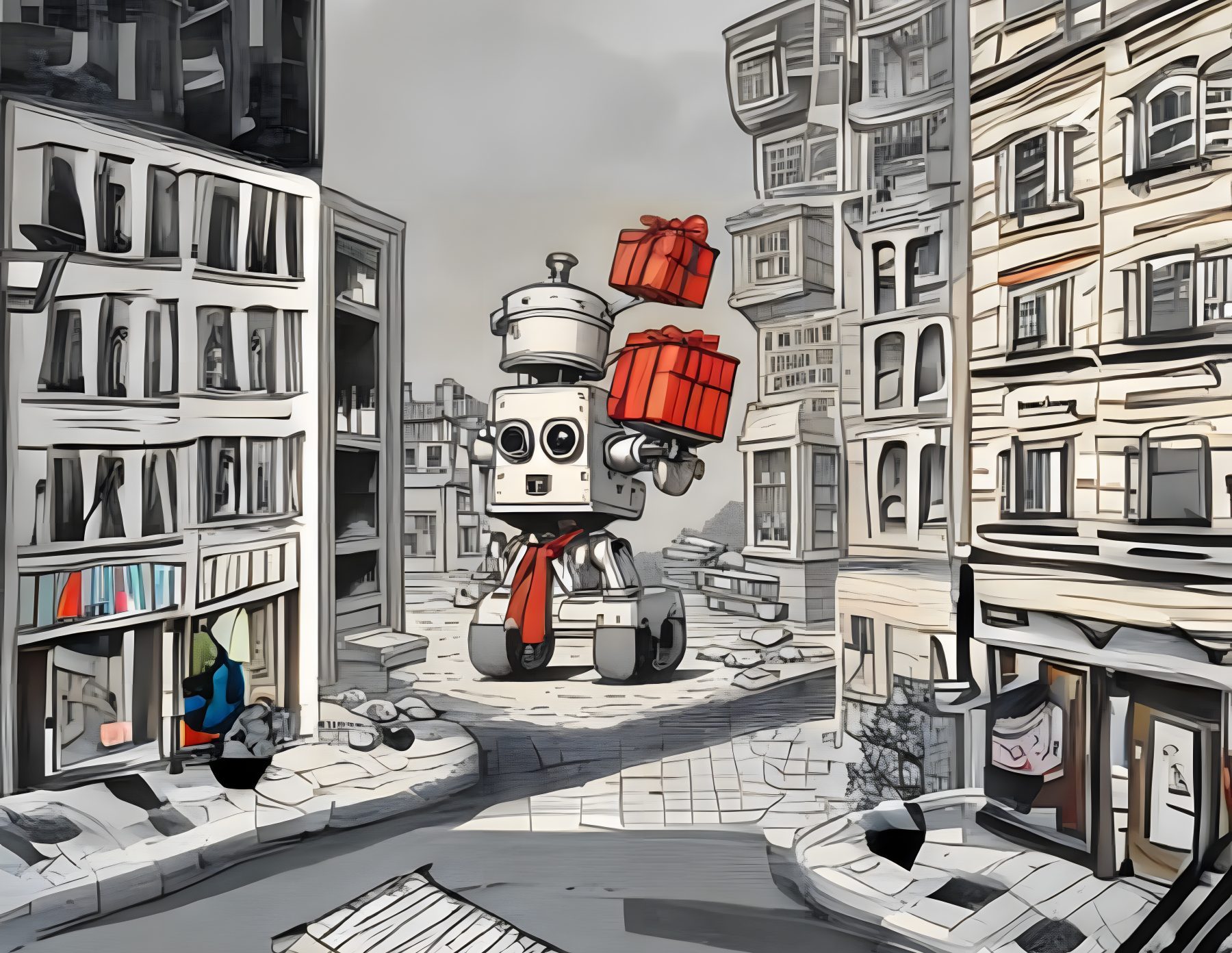 „Die Vorstellungen über die Zukunft der Arbeit gehen auseinander. Zu den positiven Entwicklungen gehört die Verringerung repetitiver und mechanischer Arbeit.“ Grafik: Erstellt von Tim Schrock; Prompt: „robot carrying gifts, ink draw illustration”, Software: deepai.org; outpainter.app; Upscayl