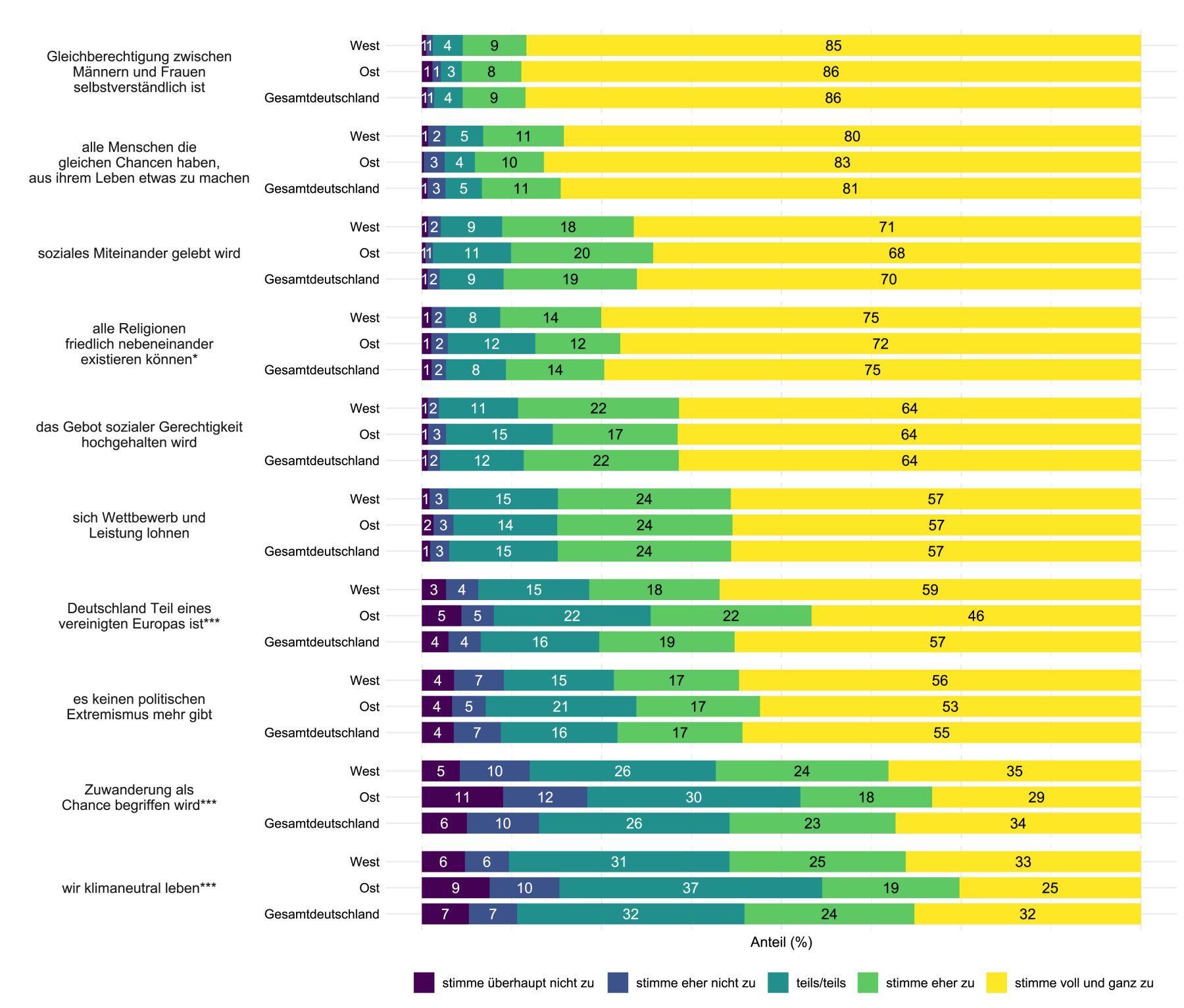 Ost- und Westdeutsche wünschen sich in gleichem Maße eine Gesellschaft, in der Männer und Frauen gleichberechtigt sind, Leistungsbereitschaft belohnt wird, Extremismus keinen Platz hat und Chancengleichheit besteht.