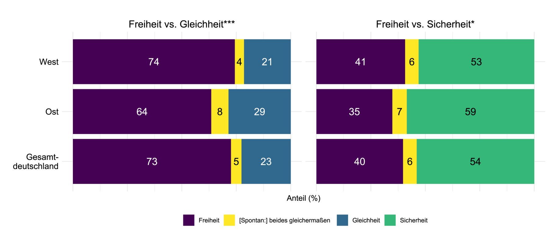 Abbildung 2: Abwägung zwischen Freiheit und Gleichheit sowie zwischen Freiheit und Sicherheit in Ost-, West- und Gesamtdeutschland (Angaben in %) Quelle: Deutschland-Monitor 2024. Abweichungen zu 100 % sind rundungsbedingt. Unterschiede sind auf einem Niveau von * p ≤ 0,05, ** p ≤ 0,01, *** p ≤ 0,001 signifikant.