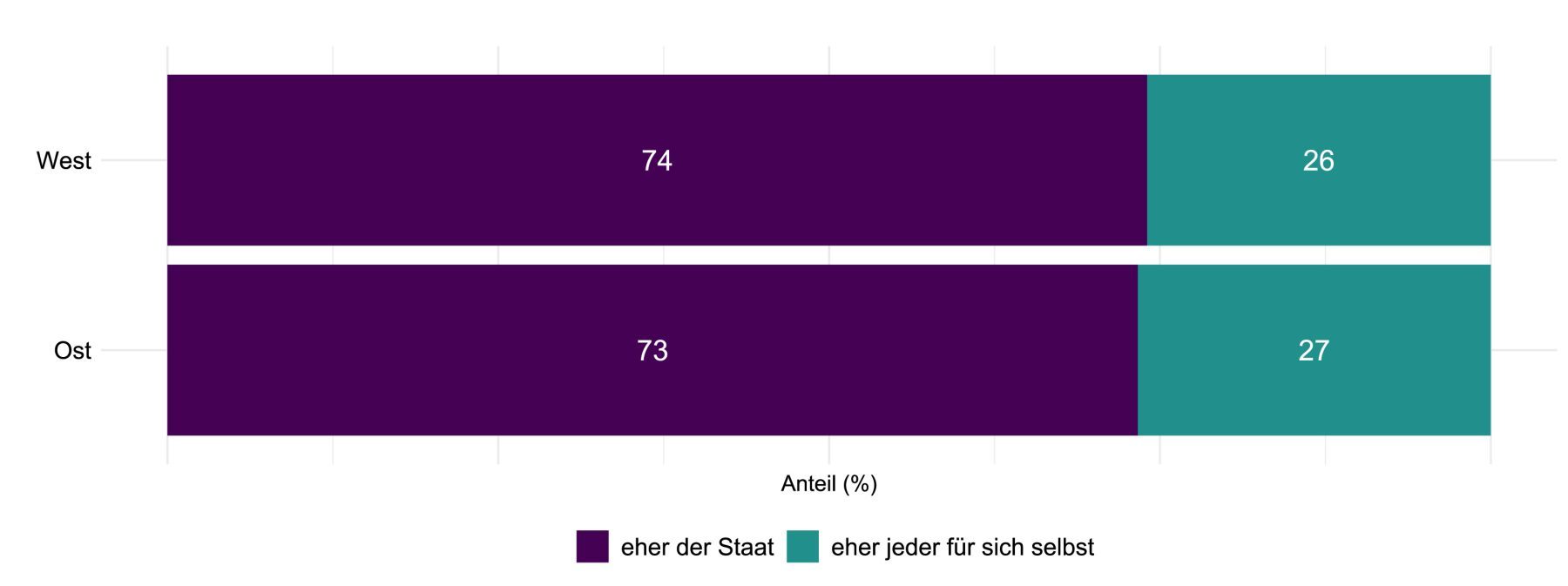 Offen ist jedoch, ob sich auch die Vorstellungen der Bevölkerung über die „gewünschte Gesellschaft“ mit ihren zentralen Werten und Zielvorstellungen zwischen Ost und West unterscheiden. Diese Frage ist nicht nur theoretischer Natur, sondern zentral für die Resilienz unseres demokratischen Gemeinwesens: Zwar ist das Vorhandensein unterschiedlicher Perspektiven und Wertvorstellungen ein wichtiges Kennzeichen unserer freien und pluralistischen Demokratie. Zugleich ist jedoch ein gewisser Konsens über zentrale Wertvorstellungen, Prinzipien und Grundrechte essenziell für das gesellschaftliche Zusammenleben.
