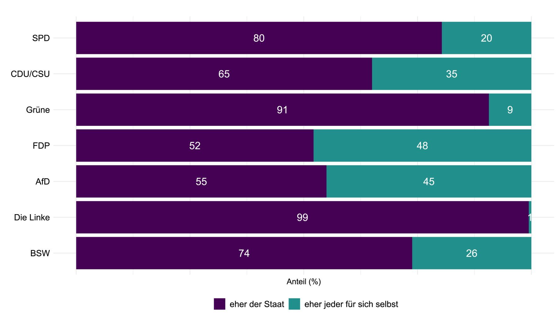 Abbildung 4: Verantwortungszuschreibung für Lebensrisiken nach nahestehender Partei Quelle: Deutschland-Monitor 2024