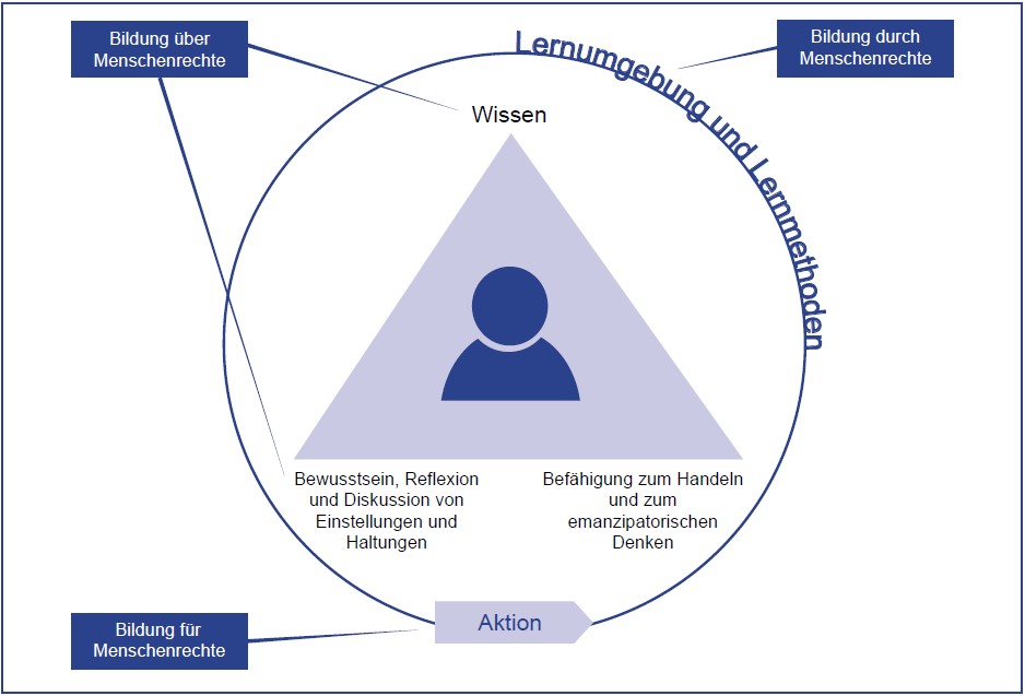 „Bildung über Menschenrechte: dies umfasst die Bereitstellung von Wissen und das Verständnis von Normen und Prinzipien der Menschenrechte sowie der ihnen zugrundeliegenden Werte und Mechanismen zu ihrem Schutz.“ (Artikel 2 UN-MRBT)