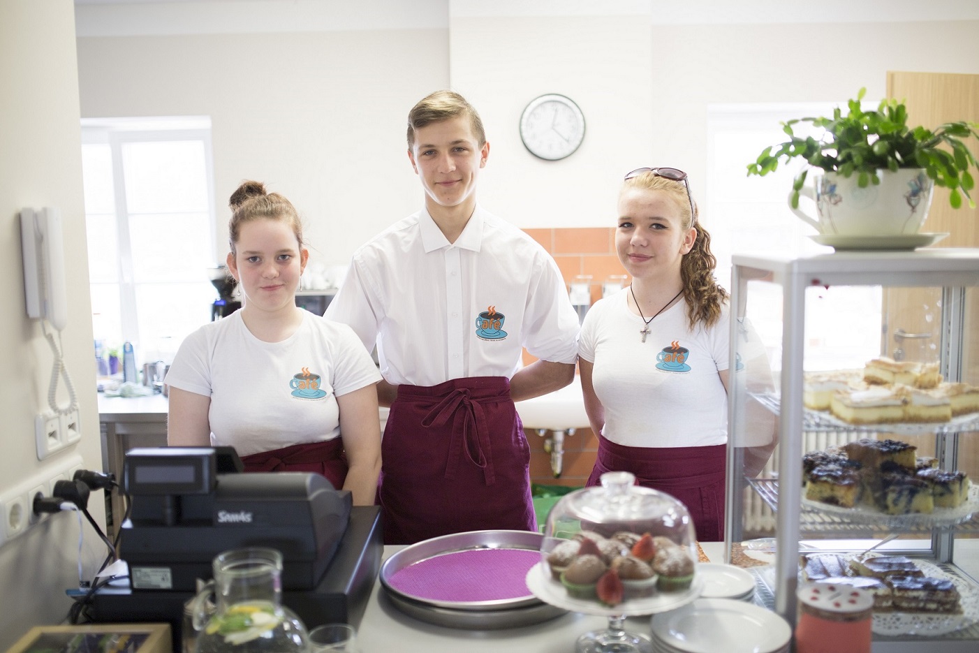 Ähnlich verhält es sich mit dem Cafébetrieb, der in Trebnitz eingerichtet wurde. Von einer „Schülerfirma“ betrieben, schafft er einen weiteren öffentlichen Zugang zur Bildungsstätte mit einem Mittagstisch sowie Kaffee und Kuchen.