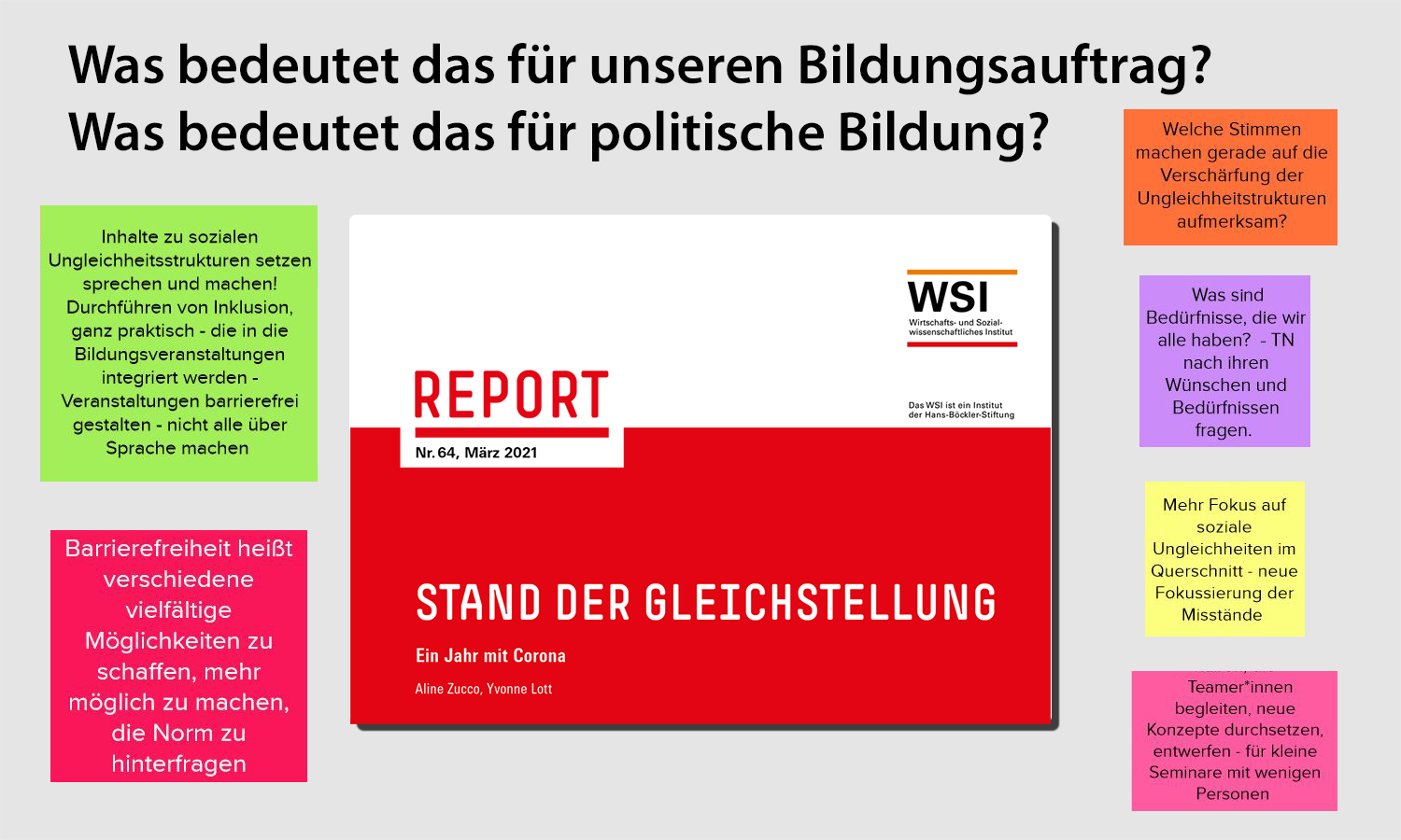 Dr. Aline Zucco, wissenschaftliche Mitarbeiterin des Wirtschafts- und Sozialwissenschaftlichen Instituts mit dem Schwerpunkt Geschlechterforschung, stellte am ersten Tag die Forschungsergebnisse der aktuellen Studie „Stand der Gleichstellung. Ein Jahr mit Corona“ vor. Die Studie betrachtet die Auswirkungen der Pandemie auf den Gender Pay Gap, auf Arbeitszeiten und die Aufteilung von Sorgearbeit. Die Entwicklungen sind noch nicht eindeutig, sichtbar wird jedoch: Die Hauptlast der Sorgearbeit (bezahlt und unbezahlt) wird auch in der Pandemie weiterhin von Frauen getragen. Zudem haben vorwiegend Frauen, bedingt durch Kita- und Schulschließungen, ihre Arbeitszeit zugunsten der Kinderbetreuung reduziert. Um einer Re-Traditionalisierung und einer Verschärfung von bestehenden Ungleichheitsstrukturen zwischen den Geschlechtern entgegenzuwirken, werden in der Studie Maßnahmen wie die Verbesserung bei der Kinderbetreuung, die Reform der Ehegattenbesteuerung bis hin zu flexiblen Teilzeitmodellen vorgeschlagen.