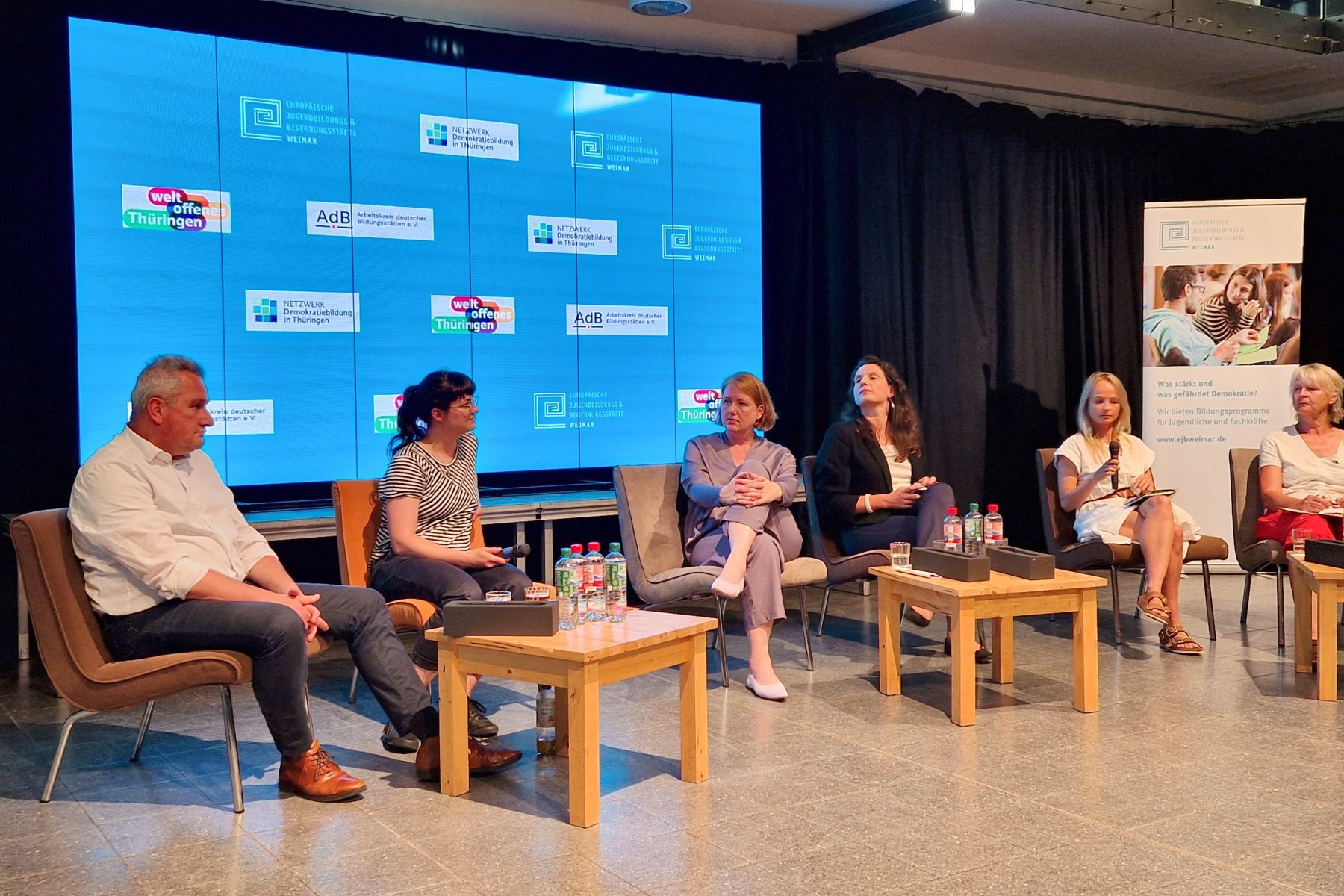 Auf ihrer Sommertour hat die Bundesministerin Lisa Paus einen Stopp in Weimar eingelegt. Sie besuchte dort eine Podiumsdiskussion mit verschiedenen Trägern der Demokratiestärkung aus ganz Thüringen. Der Einladung der Europäische Jugendbildungs- und Jugendbegegnungsstätte Weimar (EJBW) in das große Reithaus waren über 100 Besucher*innen gefolgt. Es war allen ein großes Anliegen, sich mit der Ministerin über die Situation der Demokratie in Thüringen aber auch und insbesondere über die Arbeit der Menschen zu sprechen, die sich gegen die in Thüringen als „gesichert rechtsextrem“ eingestufte AfD und ihre Positionen engagieren.