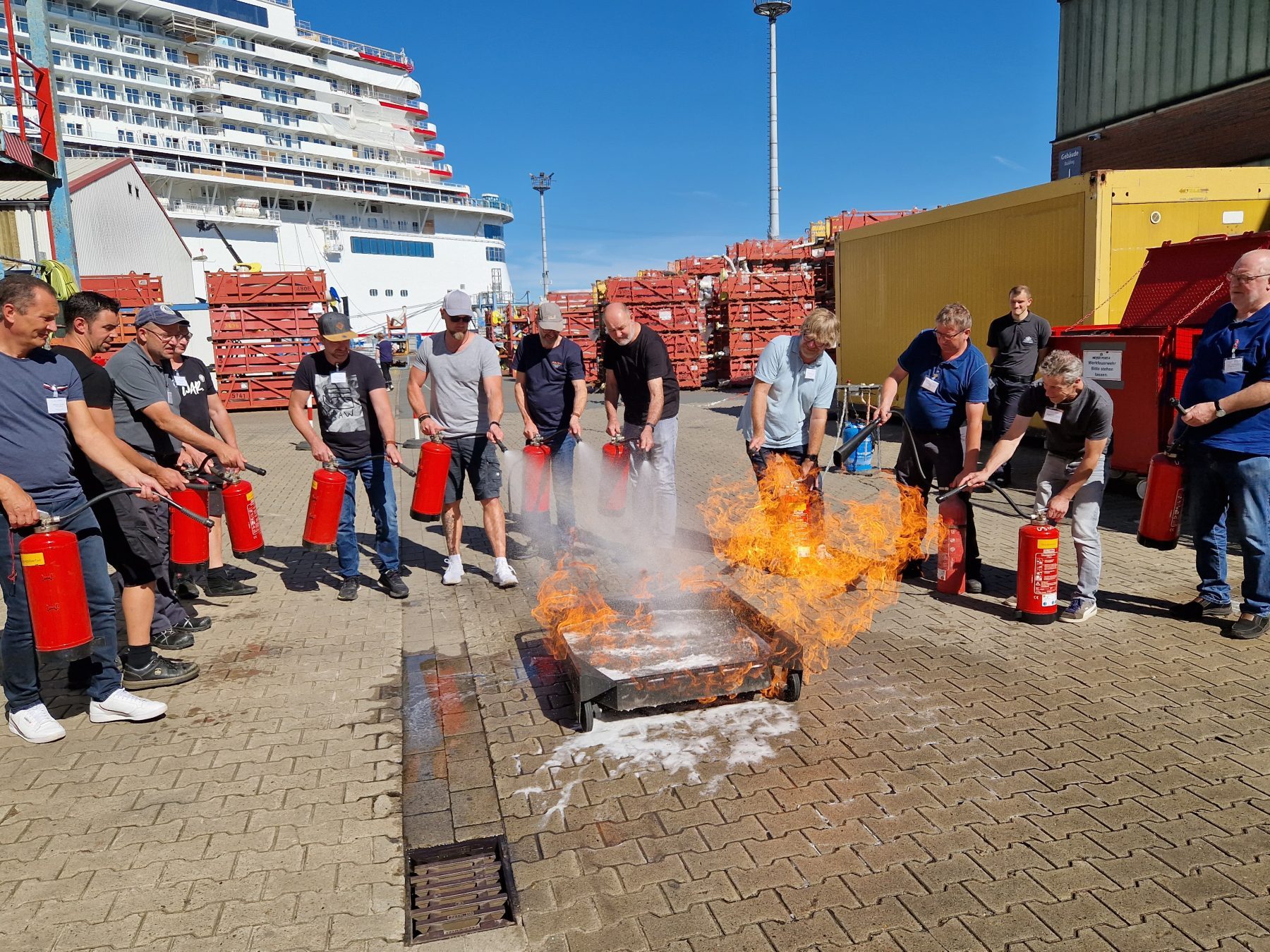 Der zweite Teil der Ausbildung war dann ganz praktisch. Am Feuerbekämpfungs-Trainingsbereich der Wehr konnte sich jeder mit dem Gebrauch von Feuerlöschern vertraut machen und aktiv ein Feuer bekämpfen. Auch ein Blick hinter die Kulissen der Feuerwehr war natürlich drin und hat alle sehr beeindruckt.