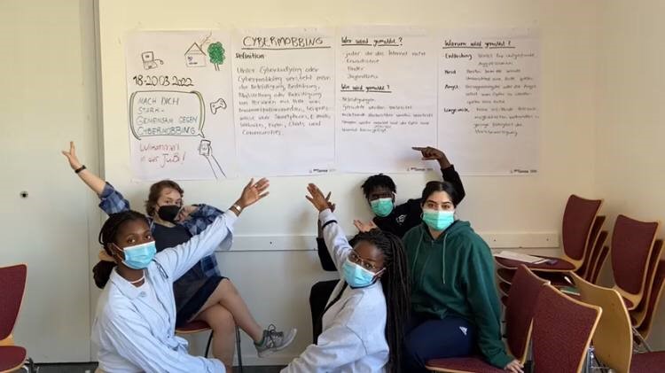 Die Teilnehmenden im Projektjahr beschäftigten sich mit den Themen Globalisierung, Nachhaltigkeit, Diskriminierung und besonders mit dem Thema Cybermobbing. Sie knüpften an ihre persönlichen Erfahrungen und Lebenswelten an. Die Wichtigkeit des Themas Cybermobbing haben sie für sich persönlich und für Jugendliche erkannt und führten ein Seminar für elf Menschen im Alter von 12 bis 17 Jahren durch. Das Cybermobbingseminar wurde direkt im Anschluss mit der Bildungsreferentin reflektiert. Alle waren sehr stolz und zufrieden mit sich und ihrem Seminar, was auch durch die positiven Rückmeldungen der Teilnehmenden widergespiegelt wurde. Die ausgewählten Methoden wurden gut angenommen und viele Teilnehmende konnten das Seminar als einen Ort nutzen, an dem sie auch von ihren persönlichen Erfahrungen berichten konnten. Gemeinsam wurde nach Lösungsstrategien für verschiedene Situationen gesucht und diese in Form von Rollenspielen durchgespielt. Auch Streitigkeiten unter den Teilnehmenden konnten die Teamenden weitestgehend ohne direktes Eingreifen der Bildungsreferentin klären.