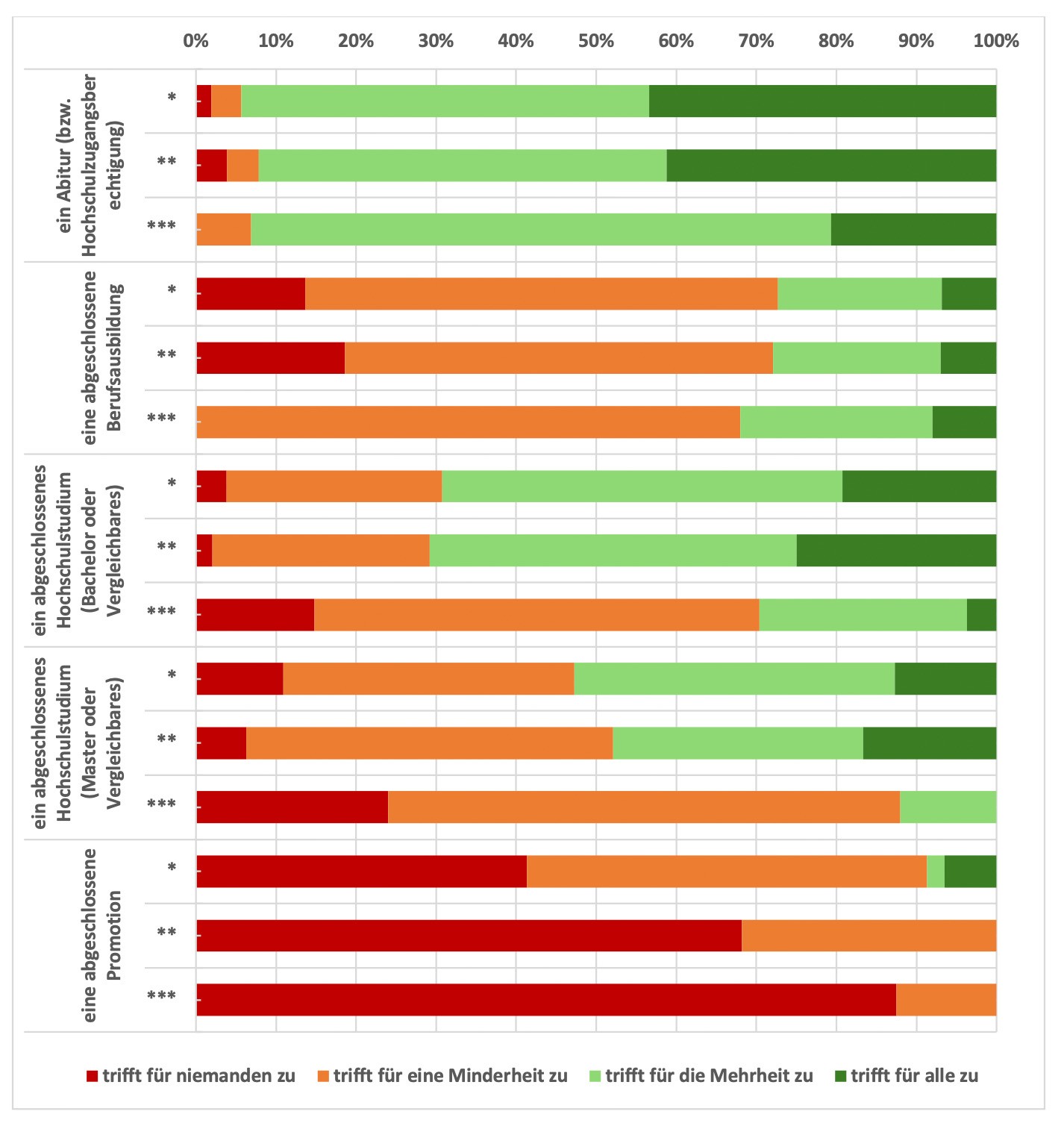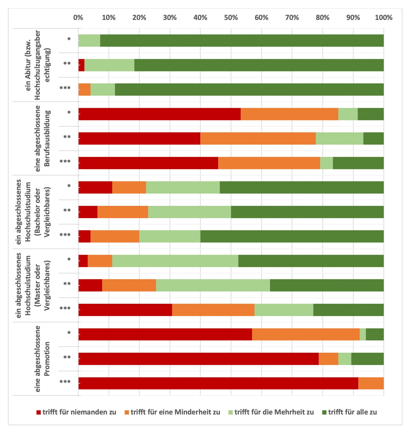 Bei den von der bpb anerkannten Trägern verfügen in über 90 % der Einrichtungen sämtliche hauptamtlich Beschäftigten über ein Abitur. In knapp 80 % der Fälle wurde berichtet, dass alle Mitarbeitenden über einen Masterabschluss verfügen. Nur sehr wenige Einrichtungen berichten, dass Personen ohne Studienabschluss bei ihnen angestellt sind.