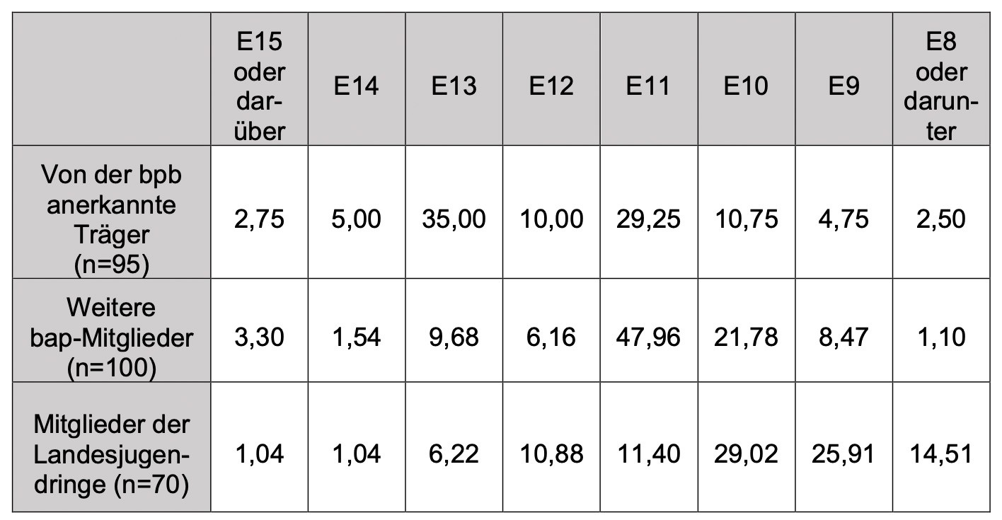 Insgesamt weisen Träger mit Anerkennung durch die bpb das höchste Vergütungsniveau auf, verfügen also überwiegend über einen vergleichsweise großen Anteil an Beschäftigten in höheren Entgeltgruppen. Die weiteren befragten Mitglieder des bap bewegen sich im mittleren Segment, während die Gehälter bei Mitgliedern der Landesjugendringe eine Konzentration in den Stufen E10 und E9 aufweisen (vgl. Tabelle 1). Im Unterschied zur Darstellung für die Qualifikationen beziehen sich die Prozentangaben also nicht auf die Träger, sondern auf die Anteile der bei den jeweiligen Trägern angestellten Personen.