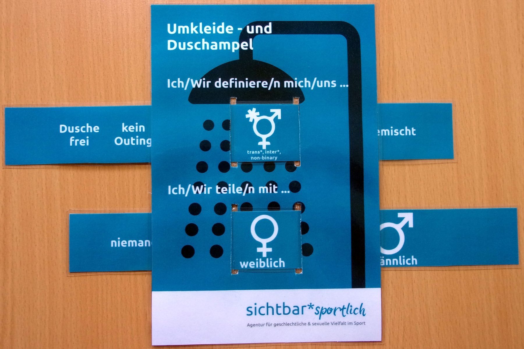 Toiletten, Umkleiden, Duschen: Nach Geschlecht getrennte Umkleiden und Sanitärräume sind für solche TIN-Personen, deren Aussehen, körperliche Merkmale oder Habitus nicht der gesellschaftlichen Vorstellung von männlich oder weiblich entsprechen, keine sicheren Räume. Bauliche Veränderungen sind oft nicht einfach möglich, aber übergangsweise können schon kleinere Veränderungen die Situation verbessern. Zum Beispiel: die Schiedsrichter*innen-Kabine als Umkleideraum anbieten, Spinde außerhalb der Umkleiden aufstellen oder die Verwendung der Duschampel von sichtbar*sportlich für geschlechtliche und sexuelle Vielfalt im Sport etablieren (https://sichtbar-sportlich.de/umkleide-und-duschampel). Auch hier ist es wichtig, den Status quo – zusammen mit möglichen Planungen – nach außen transparent zu machen.
