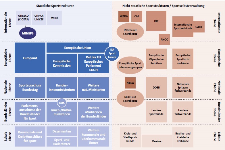 Handlungsebenen und Akteure des (deutschen) Sportsystems; SMK = Sportministerkonferenz; MINEPS = International Conference of Ministers and Senior Officials Responsible for Physical Education and Sport; GAISF = Global; Association of International Sports Federation; ANOC = Association of National Olympic Committees; NGOs = Non-Governmental Organisations/Nichtregierungsorganisationen; INGOs = Internationale Nichtregierungsorganisationen; CAS = Court of Arbitration for Sport/Internationaler Sportgerichthof; WADA = Welt-Anti-Doping-Agentur; spezifische Organisationen des Sports für Menschen mit Behinderung sind in diesem Schaubild nicht aufgeführt.